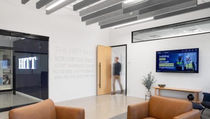 A key design element is the use of exposed concrete, which pays homage to the company’s construction roots. This is expertly juxtaposed with polished wood accents that introduce warmth and sophistication. These contrasting materials underscore HITT’s expertise in building strong, lasting structures while maintaining an inviting and comfortable environment for all.