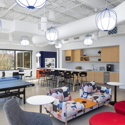 The spacious break room is designed for both social interaction and creative collaboration. A striking feature wall displays vibrant blue construction drawings, a nod to the company's brand. Another wall features a pegboard for employees to showcase personal photos, project sketches, and ideas, fostering a sense of community. This space blends a casual atmosphere with a professional environment where new ideas can flourish.