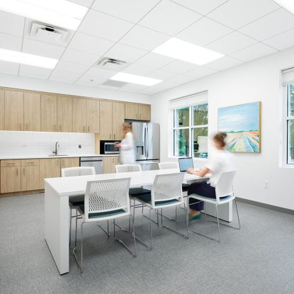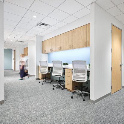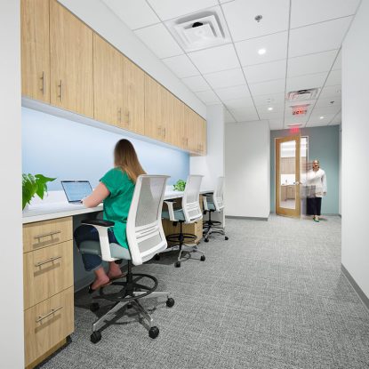 - The open corridor and nurses’ station feature custom millwork and integrated technology to maintain staff efficiency while promoting seamless collaboration.