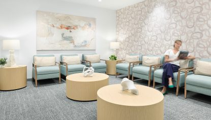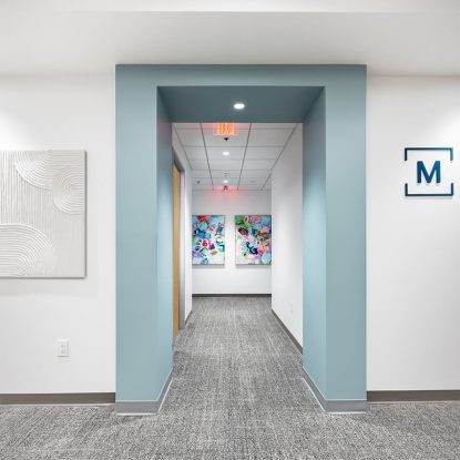 The thoughtful selection of durable yet sophisticated finishes—including patterned wall coverings, soft commercial carpeting, LVT, and a collection of original artwork—culminates in a space that is not only highly functional but also reinforces the brand promise of premium, patient-first care.