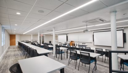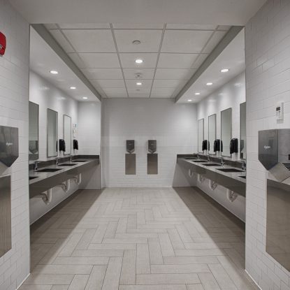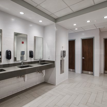 ENV collaborated with the University of Mount Saint Vincent’s to revive the classrooms, bathrooms, and campus storefront, which delivers a cohesive, modern design that enhances both function and experience. Clean lines, bright and balanced lighting, durable materials, and a refined color palette create welcoming, efficient spaces that support learning, accessibility, and student life while reflecting a contemporary campus identity.