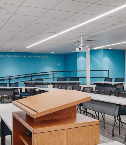 The classroom prioritizes flexibility, accessibility, and clarity. Tiered seating, integrated technology, and clean sightlines support dynamic teaching and learning environments.