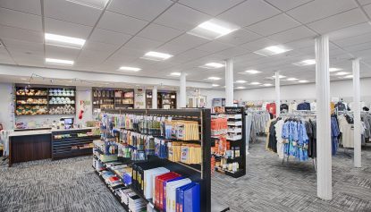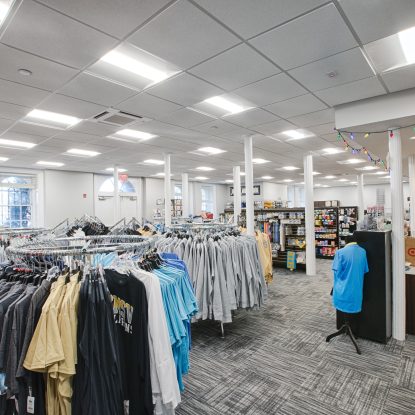 The revitalized campus store serves as an active hub for student life, combining retail functionality with an open, inviting layout. Organized shelving, clear circulation paths, and bright lighting enhance visibility and ease of use, while neutral finishes allow merchandise and branding to take center stage. Structural elements are seamlessly integrated to maintain openness and visual continuity throughout the space.