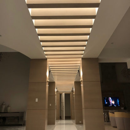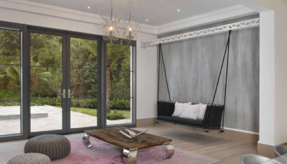 A stunning backlit wall sculpture from Ed Koehler makes a dramatic statement in the family's dining room. Flanked by a floating fireplace, this space blends seamlessly with the open floor plan of the great room.
