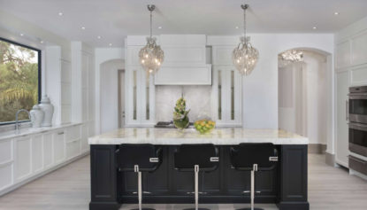 A translucent natural quartz 'Cristallo Extra' from Brazil used for the island countertop is backlit and resembles ice.