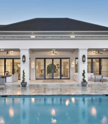 Unique features of this home include a porte cochere, a heated & screened loggia, pool cabana, movie theater room, pergola, a two-passenger elevator, arcade room, gym, and two outdoor fire pits.